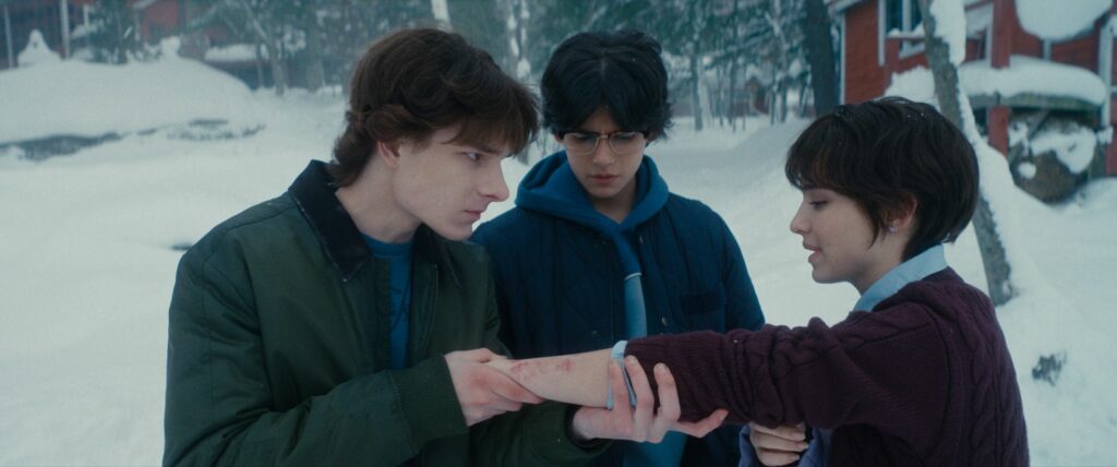 La historia no está basada en ningún relato de Joe Hill, como sí estaba la anterior. Pero el hijo de Stephen proporcionó el concepto inicial, que era muy simple: «Suena un teléfono de nuevo, Finney contesta, y es The Grabber llamando desde el infierno”. Efectivamente, muy pronto vamos a comprobar que la cabina de teléfono no funciona desde hace diez años y sin embargo recibe una llamada. «La Llamada», podíamos decir. Ha nevado tanto y el temporal es tan fuerte que se ha suspendido el campamento de invierno para jóvenes cristianos en Alpine Lake. El problema es que Finn (Mason Thames) y su hermana Gwen (Madeleine McGraw) ya están ahí y se han quedado atrapados junto con su amigo Ernesto (Miguel Mora), el encargado y dueño del complejo al que llaman Mando (Demián Bichir), su sobrina conocida como Mustang (Arianna Rivas) y la pareja de recepción que resultan ser un par de fanáticos religiosos (Maev Beaty y Graham Abbey). Siete personas atrapadas y un asesino en serie que resurge del más allá. Hace mucho frío y alguien apunta: “El infierno no son las llamas, es la nieve. Nada quema como el hielo”.
